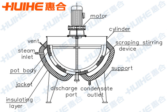 Steam heating jacketed kettle takes a certain pressure of steam as heat source. It has characteristics such as big heating area, uniform heating, high thermal efficiency, short boiling time, easy control of the heating temperature etc.