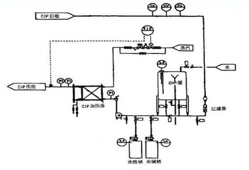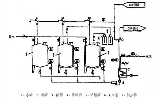 (2)該系統(tǒng)是由CIP罐、CIP泵、回流泵、清洗劑泵、換熱器和管路組成。但沒有大容量的稀釋貯桶。