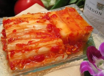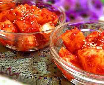 食材:圓白菜500g、黃瓜300g、大蒜250g、韓國辣醬、適量鹽、適量白糖、適量白酒、適量姜適量