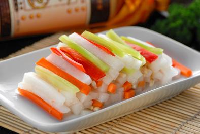 6)萵筍和胡蘿卜去皮切成條,心里美也切成條。