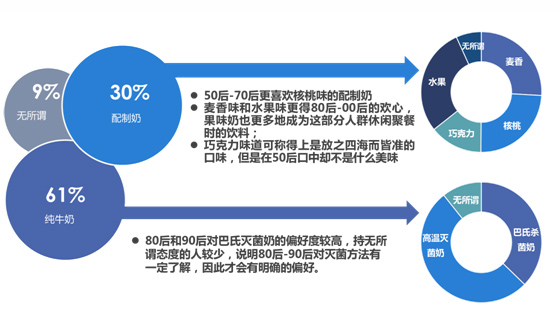 綜合年齡和區(qū)域分析發(fā)現(xiàn),中老年消費(fèi)者和70后消費(fèi)者的需求區(qū)域主要集中于西部地區(qū)的中小城市;而對于80、90和00后的消費(fèi)者,需求區(qū)域已經(jīng)開始向東部地區(qū)的一、二線城市轉(zhuǎn)移,液態(tài)奶廠商需要隨時關(guān)注市場需求的動向來決定未來營銷、鋪貨的策略等。
