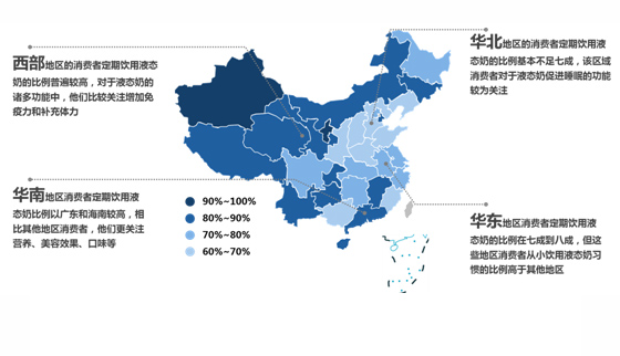 從地區(qū)上看,華北地區(qū)(除北京和天津兩個直轄市外)整體比例較低,西部地區(qū)比例很高,另外長江流域省份也相對較高。一線城市消費(fèi)者對于液態(tài)奶健康方面的需求相對更加看重;二、三線城市以及其他中小城市則更加關(guān)注液態(tài)奶的味道、美容減肥效果、滿足小孩喜好等,且更易受身邊朋友的影響。