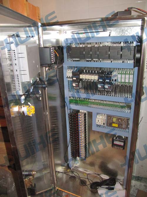 下圖為該全自動CIP清洗系統(tǒng)的控制柜內部構造及PLC顯示屏的運行界面。